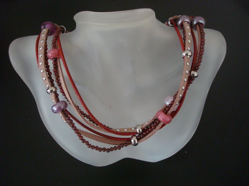 Kette aus Leder, Edelstein Granat, Glasperlen, Metall und Magnetverschluss. Kann lang oder doppelt um den Hals, oder viermal um das Handgelenk getragen werden, ca.1m