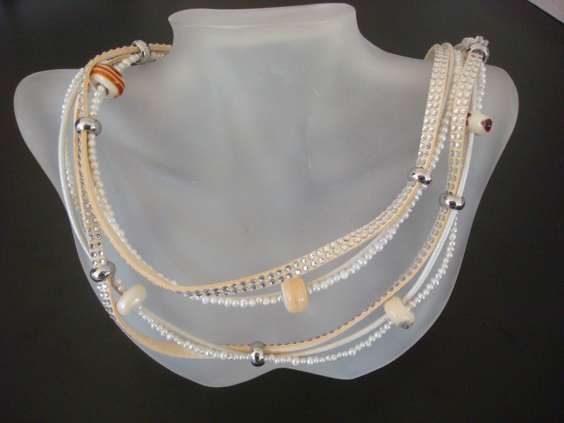 Kette aus Leder, Süsswasserperlen, Glasperlen, Metall und Magnetverschluss. Kann lang oder doppelt um den Hals, oder viermal um das Handgelenk getragen werden, ca.1m.