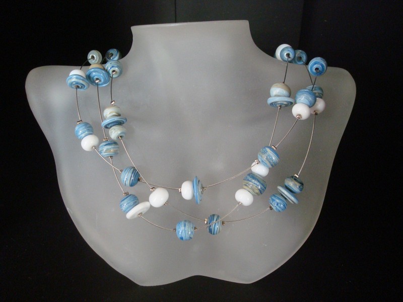 Feine Glaskette, drei Stränge blau weiss, ca.45 cm.
