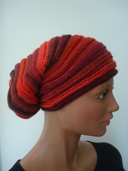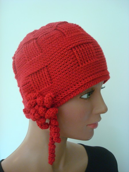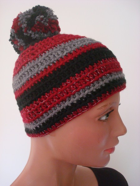 Mütze, dunkelrot, Wolle/Synthetik, handgestrickt.