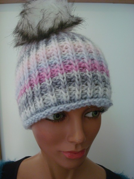 Mütze, wollweiss rosa grau glitzer, Wolle/Synthetik, handgestrickt.